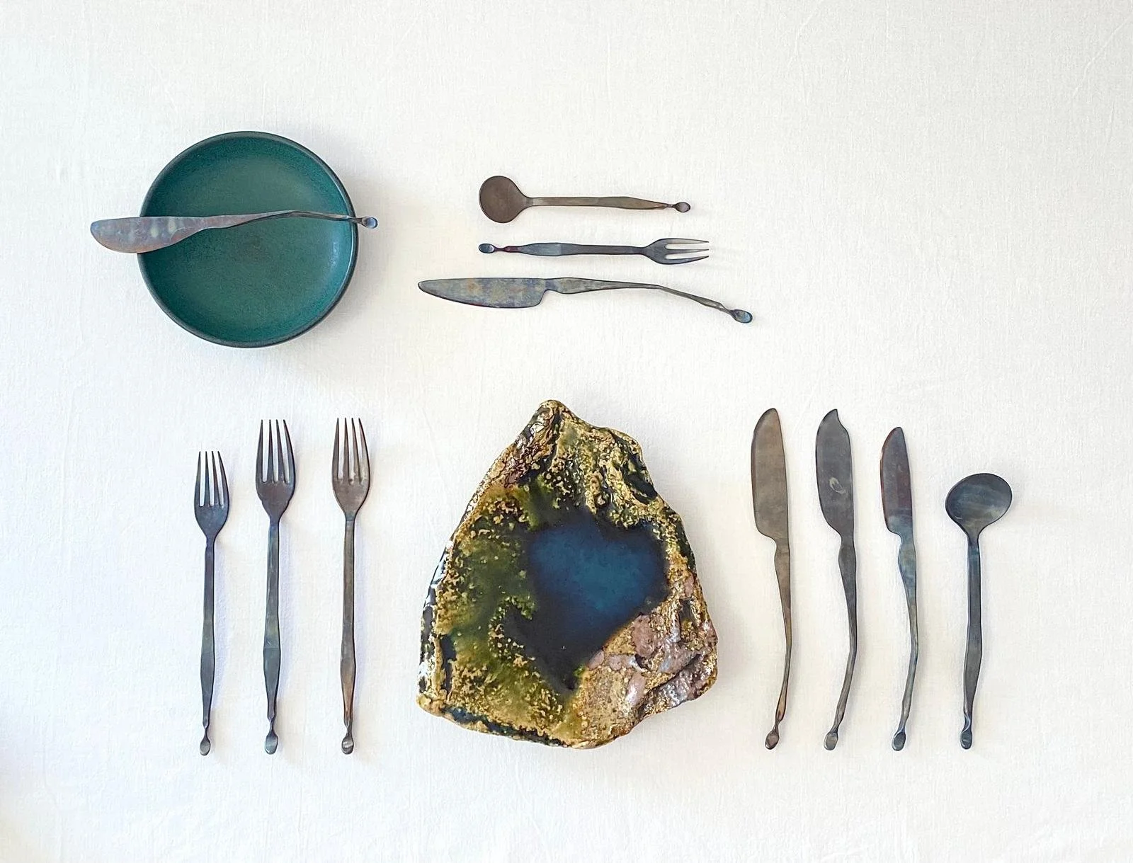 His cutlery stands out for its contemporary design, featuring an aged patina that deepens and evolves with time, adding character to each piece. The striking blue and black tones of the cutlery are achieved by individually heating stainless steel to around 600–700°C, resulting in natural variations that make every item unique.