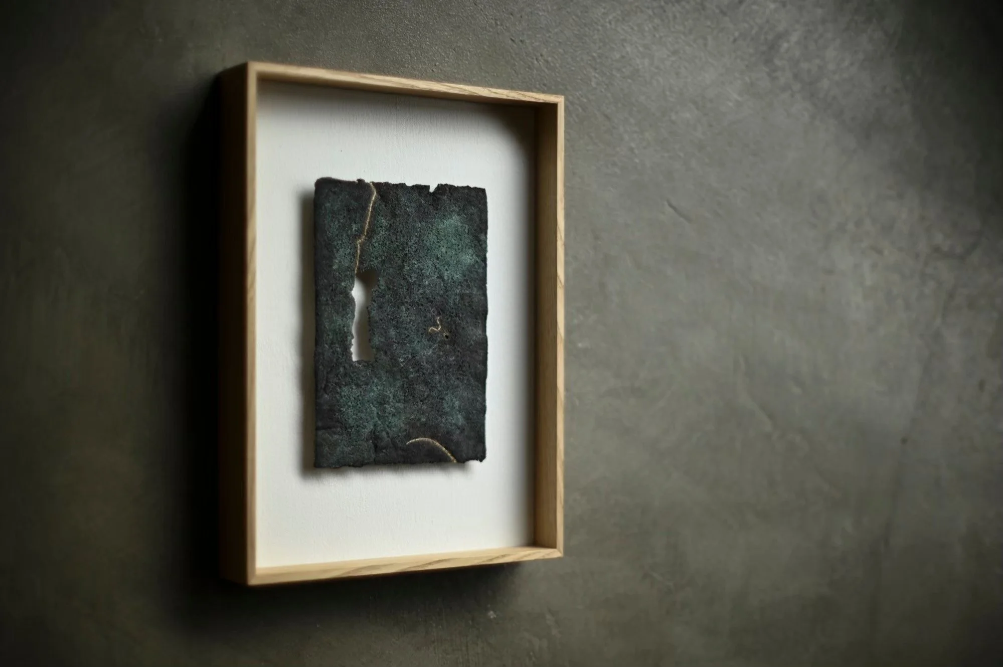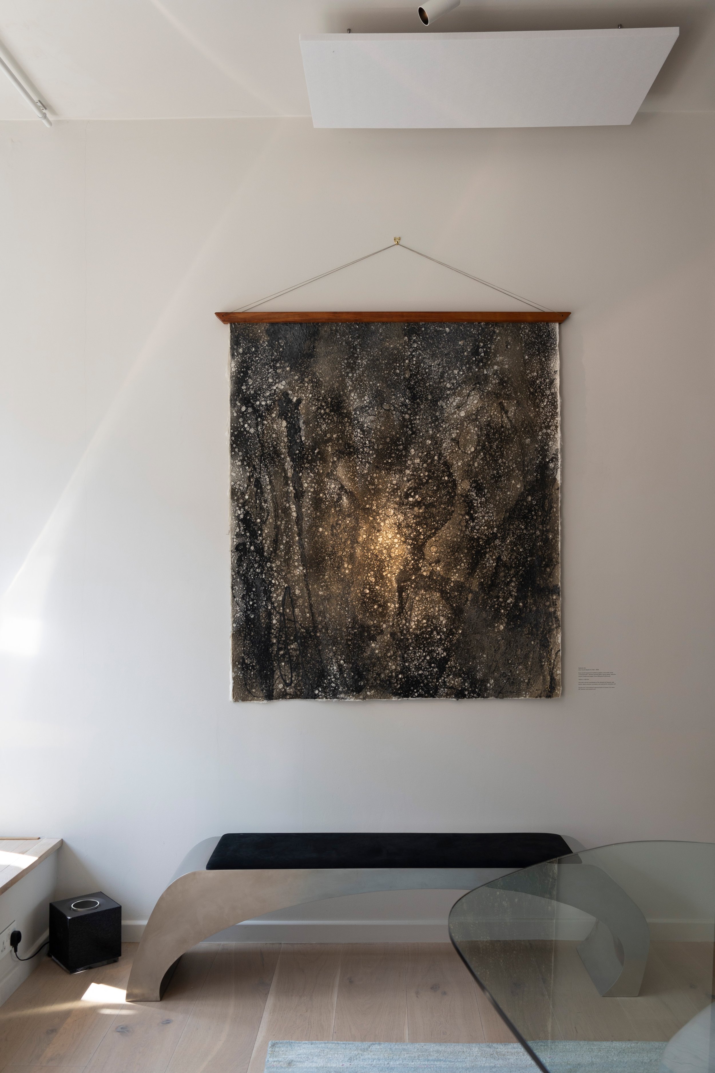 Her process is as much about listening to the landscape as it is about making. Often created during residencies or site-specific journeys, each piece incorporates local fibres—such as kozo, mitsumata, and ganpi—collected and prepared by hand. At times, metal powders and sand are also introduced, embedding traces of place within the surface of the paper itself.