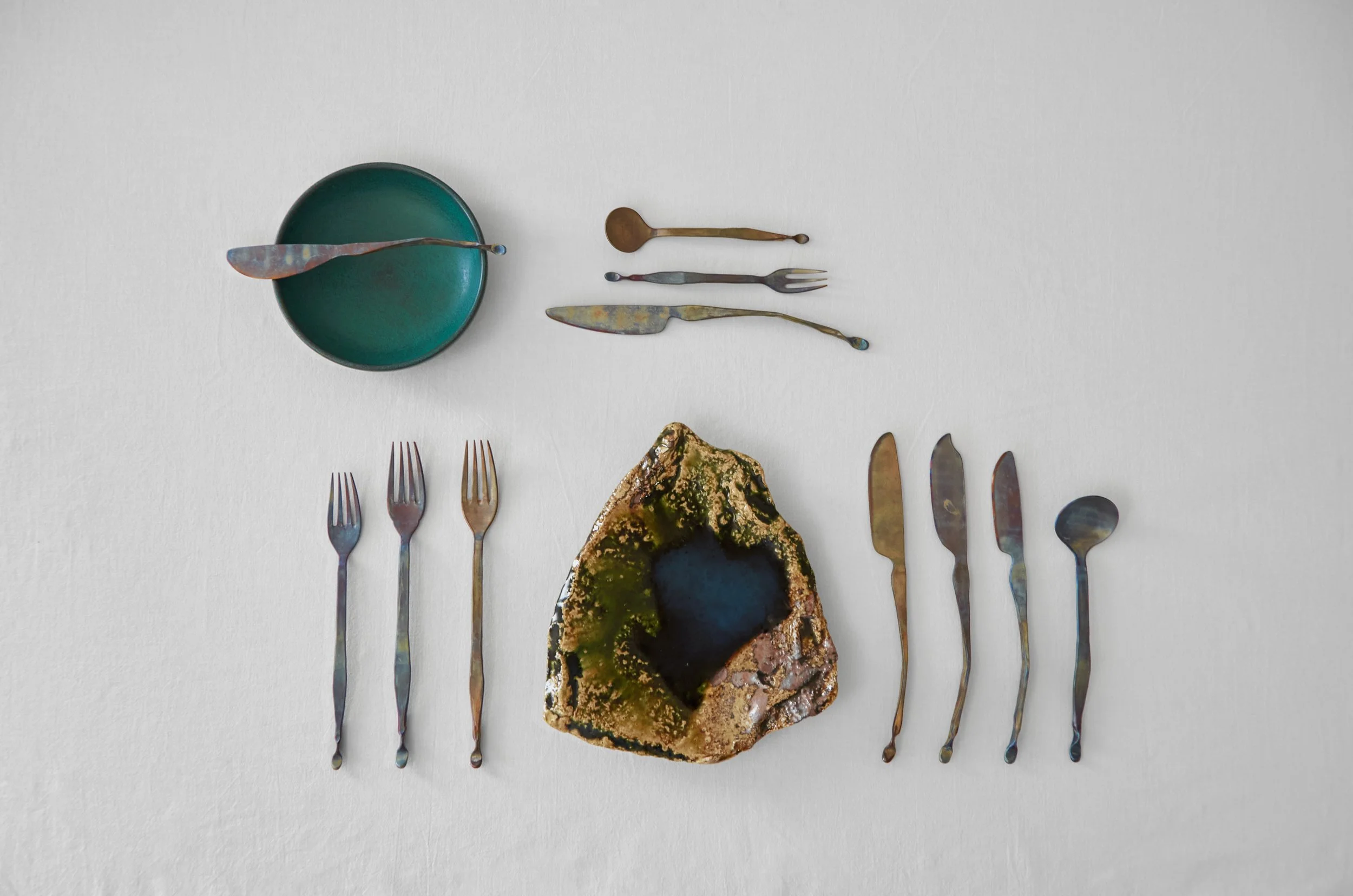 Meanwhile, his plates—crafted from brass, aluminium, and stainless steel—are finished to complement the cutlery’s aesthetic. Brass is treated during forming with chemical processes and polishing to reveal warm, antique hues, while aluminium is polished post-forming to a refined sheen.
